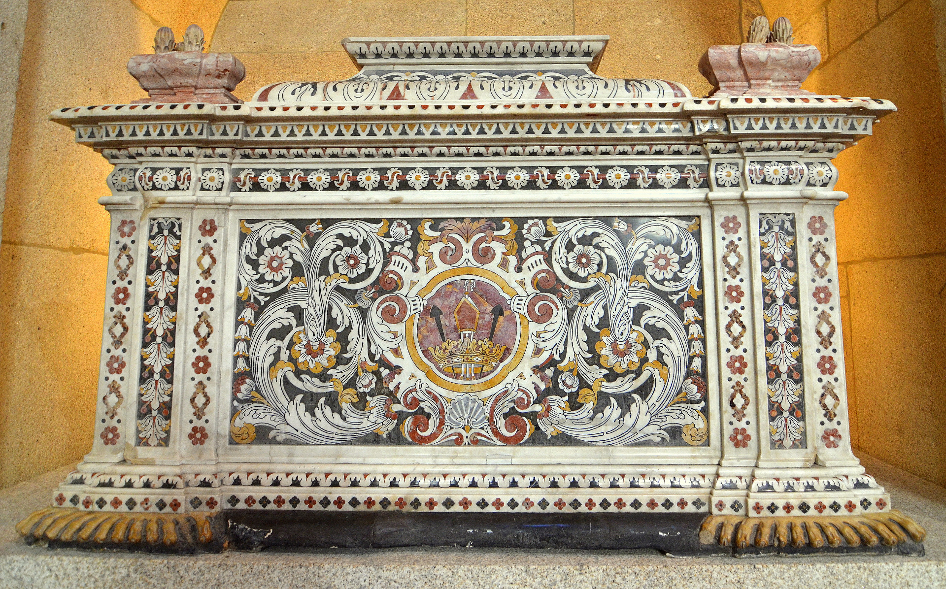 La parte delantera está encimada por esculturas de granito que representan los Apóstoles. Al centro preside la imagen, también de granito, del patrón de la Iglesia - São João Marcos (San Juan Marcos) -, cuyas reliquias están recogidas en el interior de un túmulo monumental de marmóreo blanco con embutidos de varios colores, para donde fueran transferidas en 1718, por iniciativa del arzobispo D. Rodrigo de Moura Teles. La urna primitiva, que vino de una antigua ermita demolida, esta puesta sobre este conjunto.